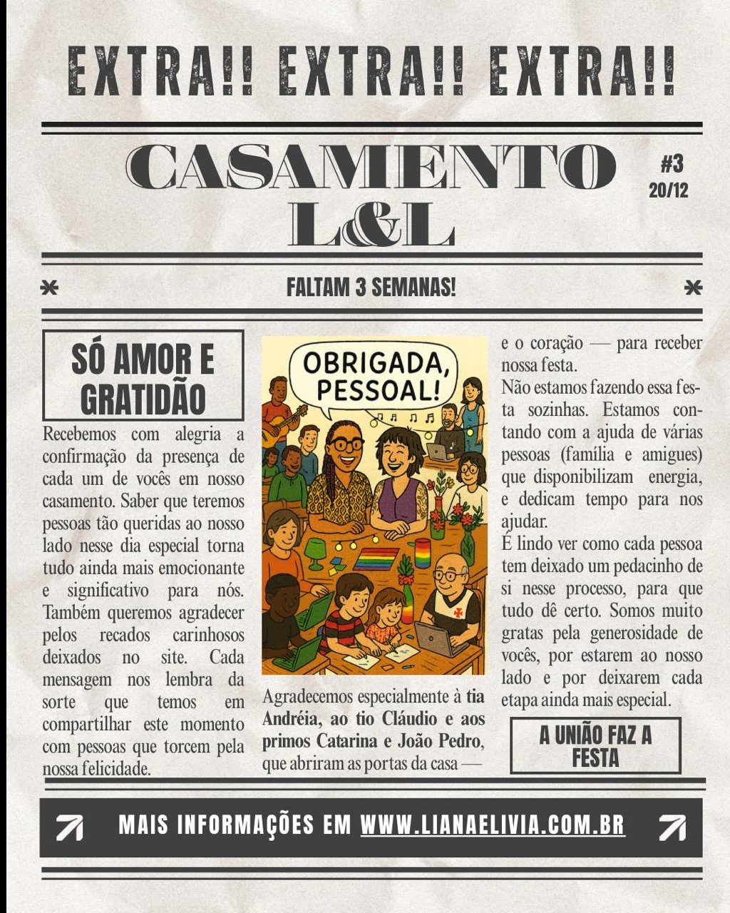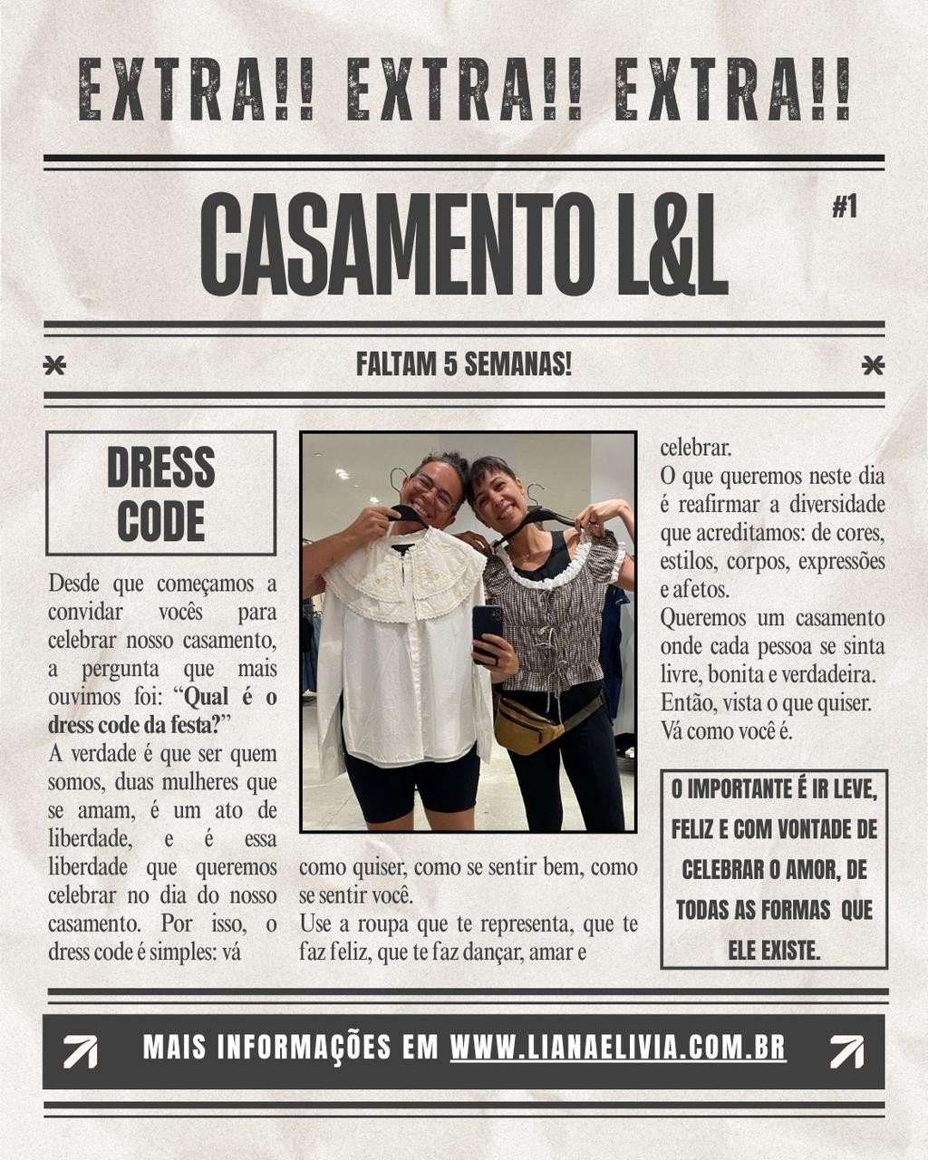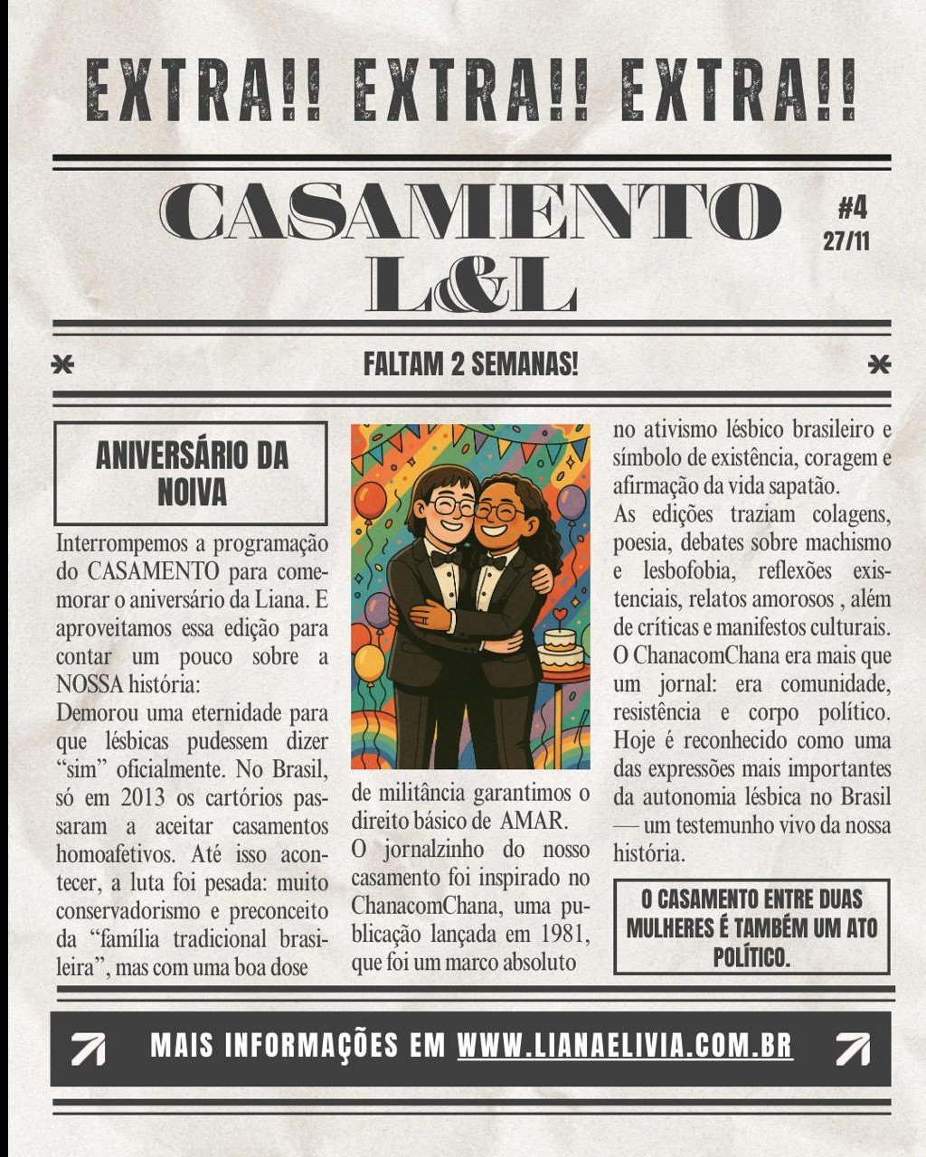 Que alegria celebrar o amor de vocês! Liana e Lívia, que esta união seja repleta de respeito, cumplicidade e felicidade. Que cada dia juntas fortaleça ainda mais a linda história que estão construindo. Recebam nossos parabéns e votos de uma vida plena de amor e realizações. ????❤️ Amamos vocês!!!